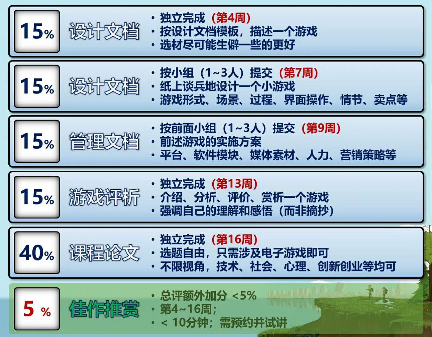 根据安排,授课内容囊括了发展史、职业体系和岗位职责、设计流程、网游、手游、开发工具、用户体验、未来技术、电子竞技等十多个方面,而学生也需要提交游戏的设计文档、管理文档、游戏评析作为课程作业。为保证专业性,陈江还专门邀请了北大心理辅导中心的同事来主讲电子游戏涉及到的人性、伦理道德、成瘾与克服等问题。