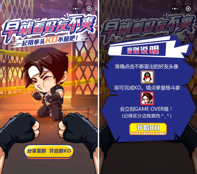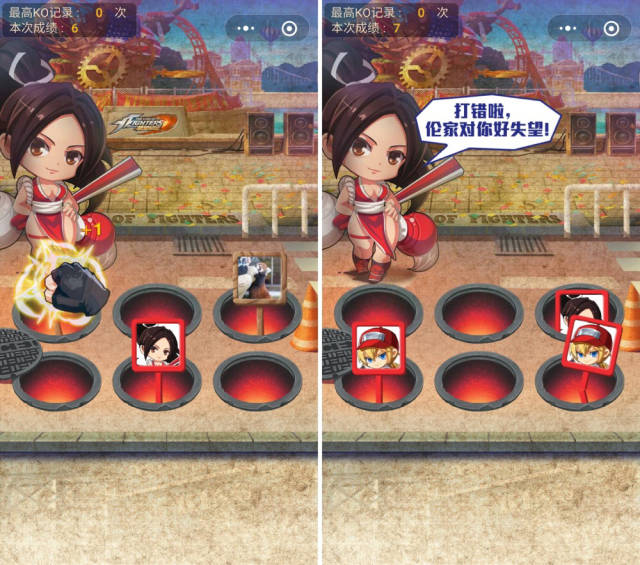六个「地鼠洞」会不断冒出群成员的头像,对其点击就能得分。而在群成员头像中,偶尔会夹杂着《拳皇》系列角色,一旦点错他们就会马上 game over。
