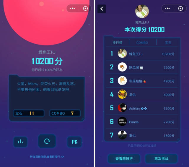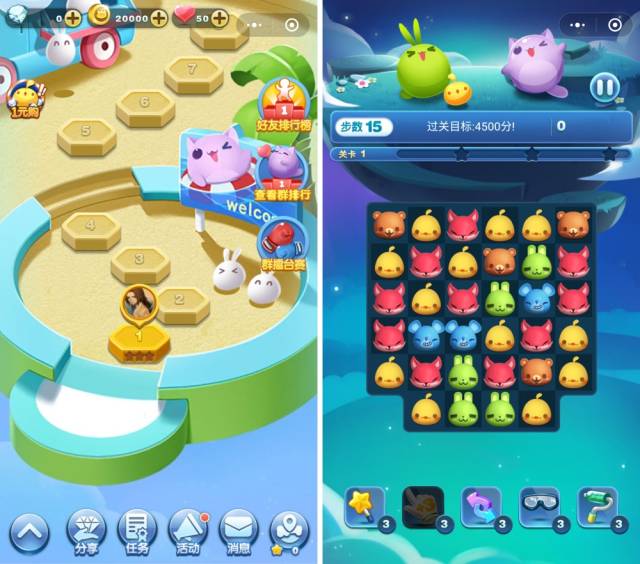 与 App 有所差异的是,它支持「群排行榜」功能。将游戏分享给好友,「爱消除乐园」小游戏就可以给每个微信群建立不同的排行榜。