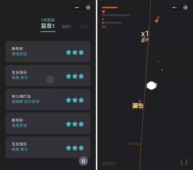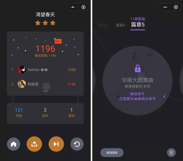 「乐动音符」一共有 5 个音乐章节。从第二章节开始,每个章节都会要求满足「星星数」才能解锁。此外,你也可以像「跳一跳」一样,邀请好友围观你的游戏过程。