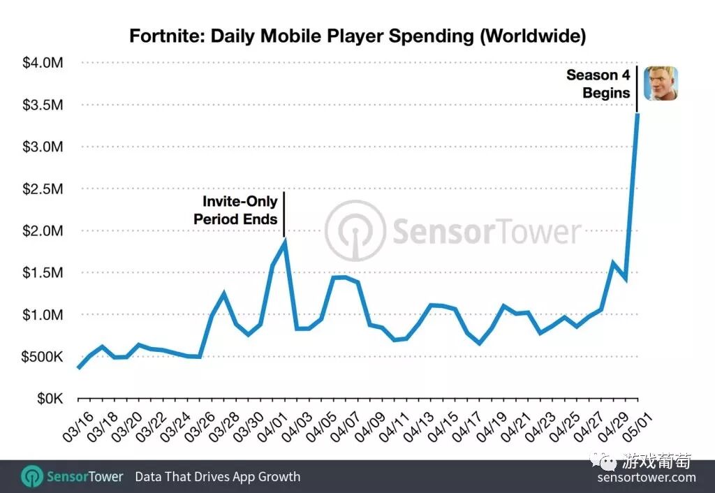 游戏葡萄5月7日消息,Epic Games于5月1日正式推出《堡垒之夜》第四赛季,根据移动应用商店情报公司Sensor Tower的预测,在第四赛季内容的推动下,《堡垒之夜》iOS版本的总收入已经突破了5000万美元。