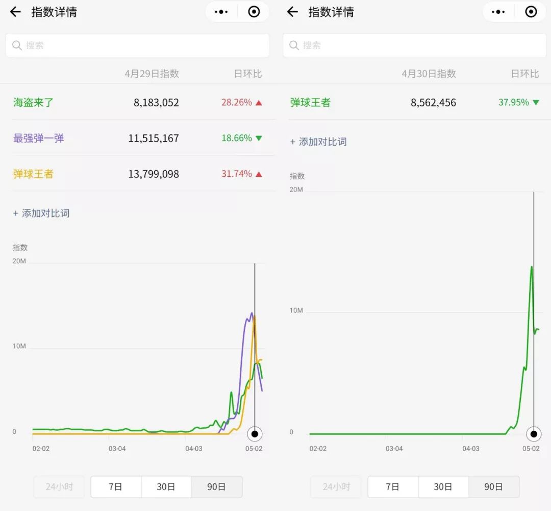 此话并非是空穴来风,从微信指数上我们已经能够窥得。通过观察“最强弹一弹”、“弹球王者”和“海盗来了”等关键词的指数走势图不难看出,这些小游戏的热度在五一期间达到顶点之后很快就降了下来。