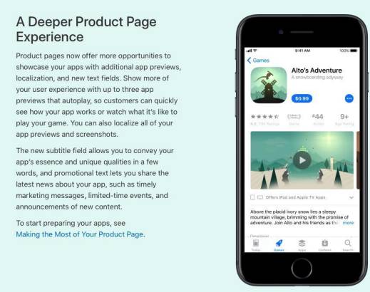 进到去游戏介绍页面里后我们发现,App Store着重放大了展示产品短视频的板块。以前用于堆砌关键词的副标题单独提出来作为subtitle,30个字符,补充说明产品主要功能和特征。增加Promotional Test,作为促销、新功能、活动、公告的说明,可随时更改。