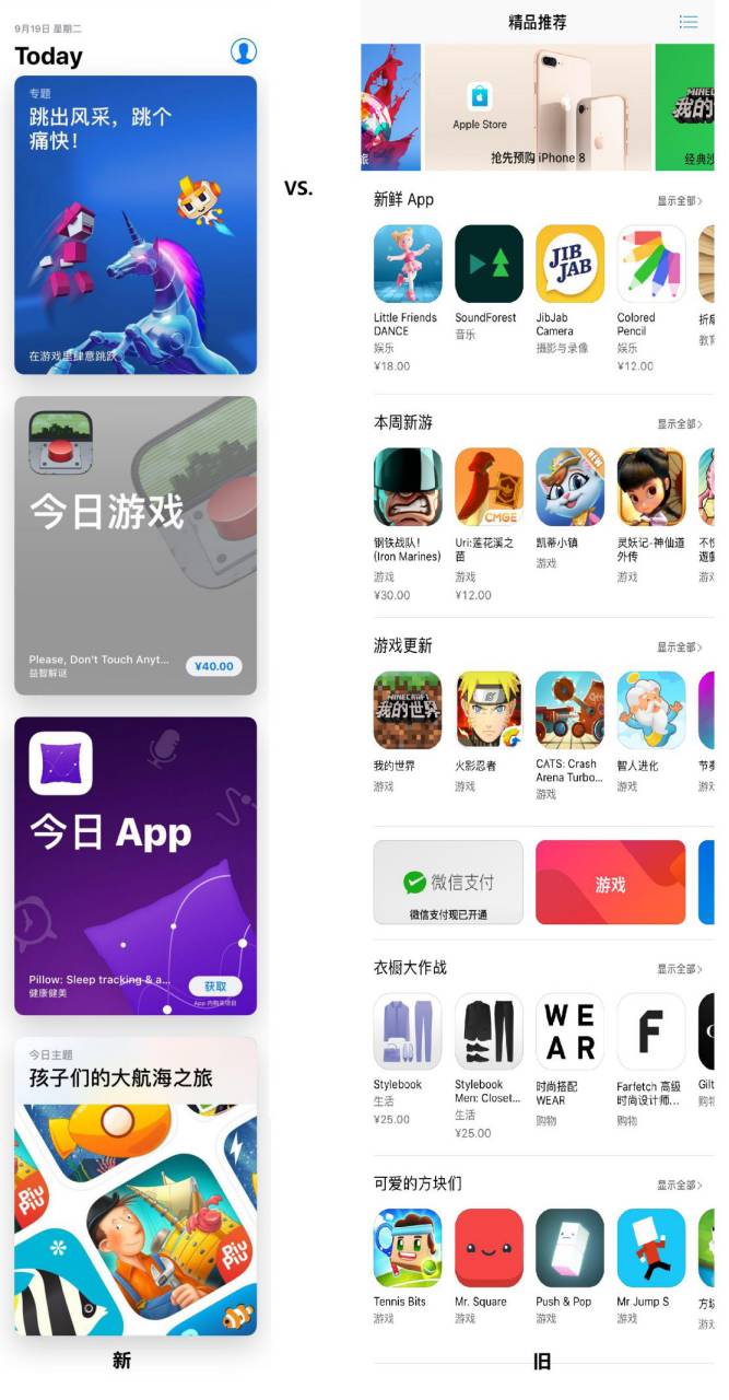 图中可以看到,新版的主页比起旧版的“应用堆积形”排放要简约得多。而这个叫“今日”的页面叫做,每天都会更新4个专题,内容包括今日App、今日游戏、今日主题、小众精选、主打推荐、快速上手、游戏人生、幕后花絮等等,在这其中可以发现游戏内容受到推荐的比重非常之高,而且每日4个专题也让聚焦更加深度。这其实对于游戏开发者来说,是一件好事。特别是对于一些中小型的独立游戏厂商来说,如果自己的游戏被苹果推荐选中的话,那么就可以在某一天的“今日游戏”里,以几乎占据整个屏幕的比例大小的游戏图片,去给玩家和用户展示自己的游戏,所以,游戏质量应该会重新得到各大厂商的重视。