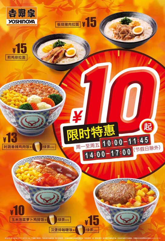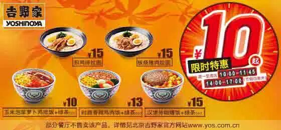 自2014年9月15日起,吉野家推出“限时特惠”促销活动:周一至周五10:00-11:45,14:00-17:00(节假日除外),提供指定的5款产品,有面有饭,优惠价只要10元起。