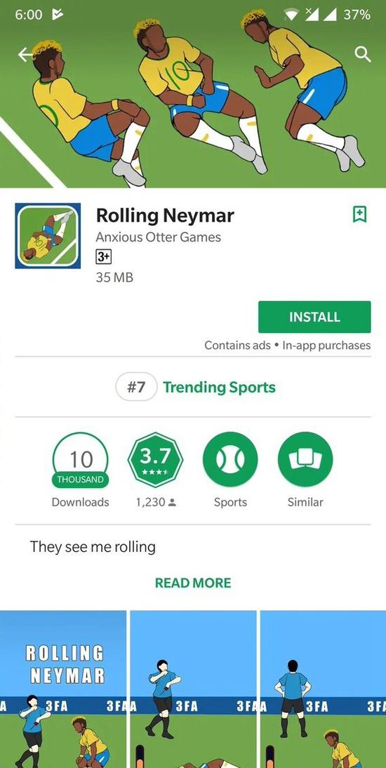 本届世界杯,内马尔被侵犯后夸张的翻滚动作让他成为了全民恶搞的对象。近日,一款名为“Rolling Neymar”(翻滚吧,内马尔)的游戏上架Google Play商店。游戏中的角色依靠在球场上的翻滚动作赢得裁判的关注。如果裁判转身时,角色刚好在地上表现出痛苦状,就可以得分。这款游戏上线数日已经突破1万下载量。