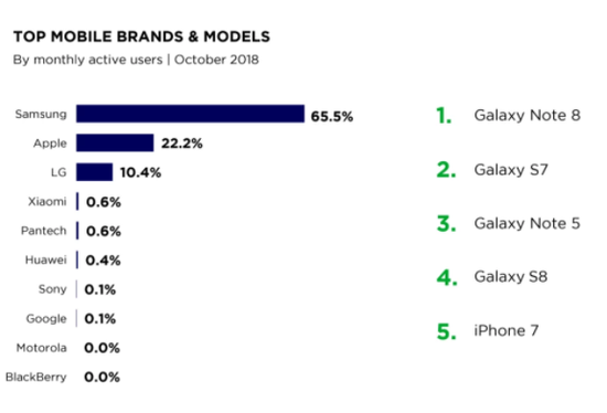 韩国智能手机制造商三星(Samsung)在智能手机设备的扩散中发挥了基础性作用。2018年10月,韩国每三部手机中就有两部手机是三星手机。与此同时,苹果在22.2%的低位苦苦挣扎,LG也紧随其后,在10.4%的低位苦苦挣扎。在韩国最常见的五款手机中,有四款都是三星Galaxy手机的变种,而韩国超过一半的活跃手机都是高端手机。