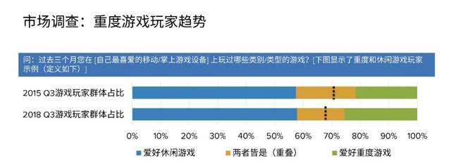 此外,重度化已成趋势。相比于2015年同期,2018年Q3游戏玩家群体占比重,重度游戏有了明显的提升。