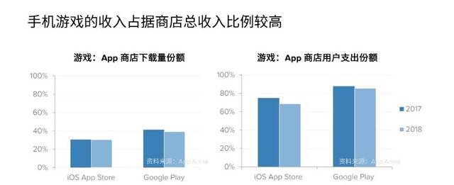 2018年,游戏在全球App Store和Google Play综合用户支出总量中的占比接近75%,但仅占总下载量35%多一点。App Annie认为,App内订阅促进了非游戏类用户支出所占份额的增加。此外,与iOS相比,游戏在Google Play总用户支出中占据更大的份额;但2018年,游戏方面,全球iOS的用户支出比Google Play高出近50%。