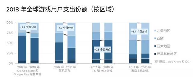 另外,尽管2018年大半年时间,中国新游戏版号停止发放,但亚太地区在 PC/Mac 支出方面仍有一定增长。