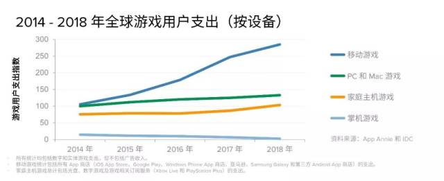 报告指出,2014年移动游戏首次超过家庭主机游戏及PC和Mac游戏,成为用户支出最高的游戏类别。到了2018年,由于用户数量和平均用户支出的增加,全球移动游戏用户支出达到PC/Mac游戏的2.1倍,家庭主机游戏的2.8倍。