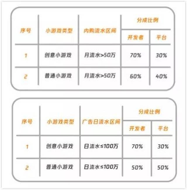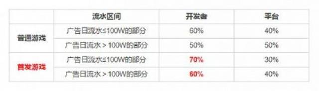 除了渠道费外,首发游戏在广告和内购两项收入上也享有一定的分成优惠。据介绍,普通游戏广告日流水收入不高于100万的部分,开发者的分成比例是60%;超过100万的部分,开发者和平台对半分。首发游戏则享有10%的分成优惠。