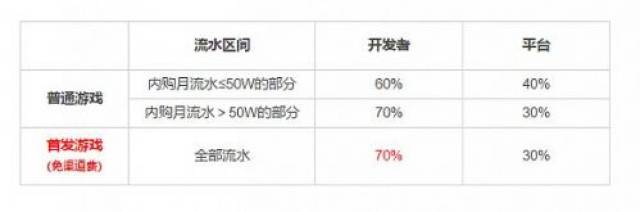 如果开发者在游戏中设置了内购,那游戏必须获得版号。普通游戏内购月流水不高于50万的部分,开发者的分成比例是60%;超过50万的部分,开发者的分成比例是70%。首发游戏在全部流水的分成比例均为70%。