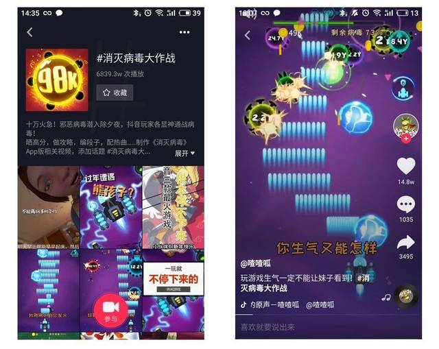 早在「音跃球球」小游戏推出前,很多休闲游戏都靠抖音成功开启了自己的爆款吸量之路,最近的一个典型例子莫过于在春节期间强势突围的「消灭病毒」。游戏近7000万的话题播放量,让这款在2月上线的新游成功登顶国内App Store免费榜榜首。