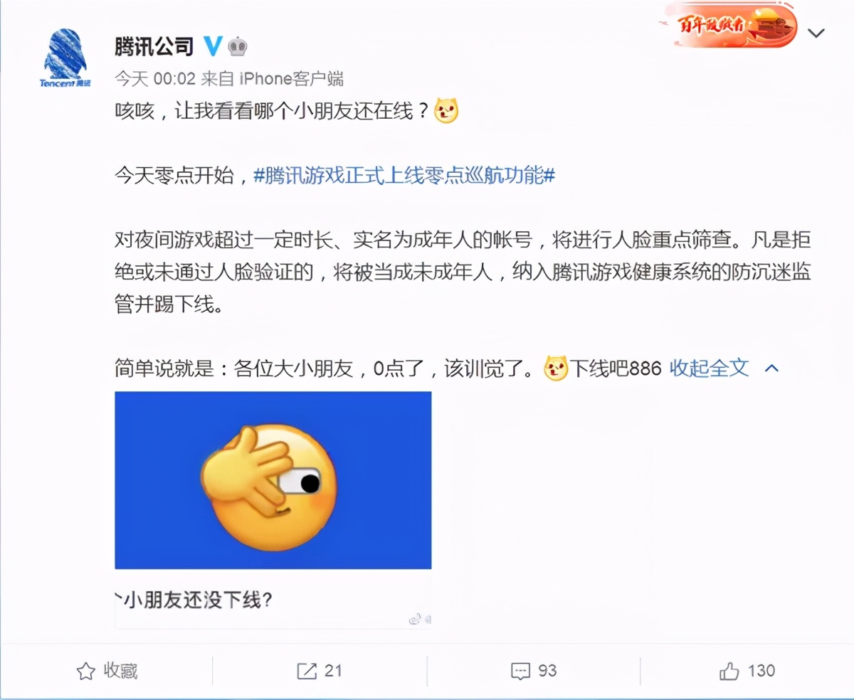 腾讯表示,对夜间游戏超过一定时长、实名为成年人的帐号,将进行人脸重点筛查。凡是拒绝或未通过人脸验证的,将被当成未成年人,纳入腾讯游戏健康系统的防沉迷监管并踢下线。