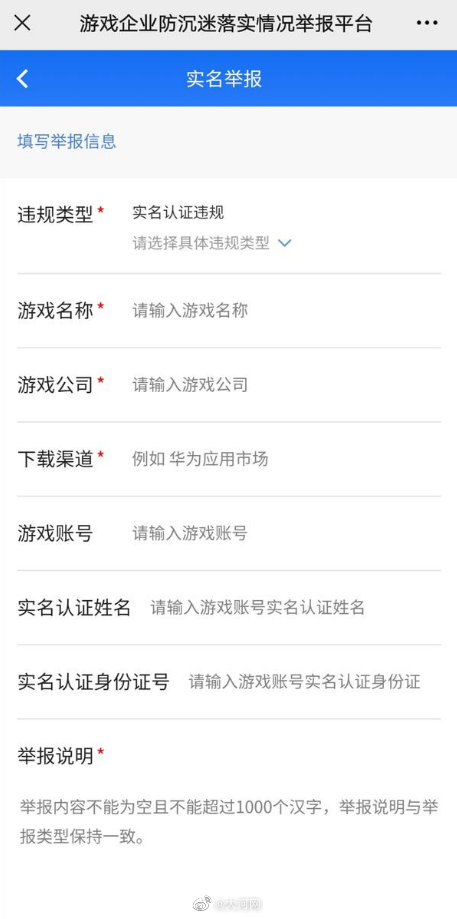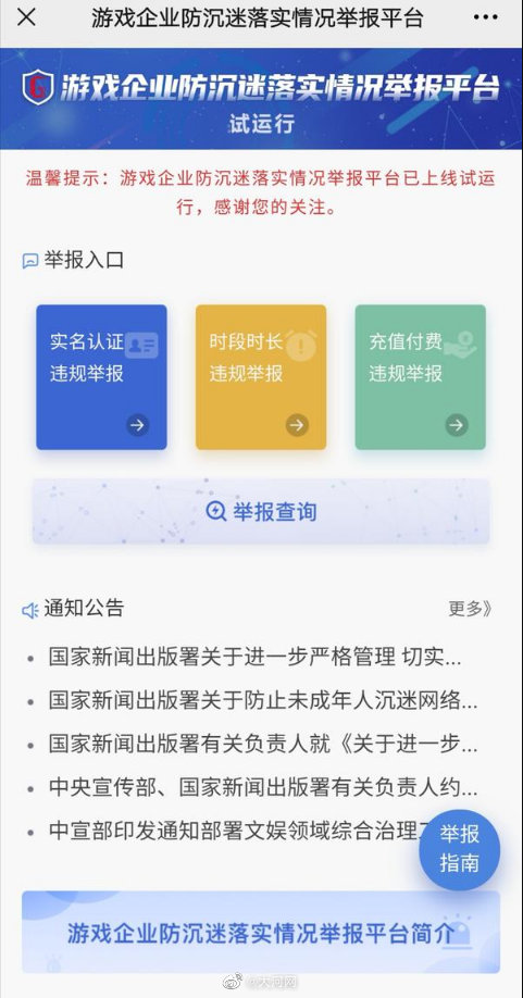 【#国家新闻出版署上线游戏企业防沉迷落实情况举报平台# 实名认证、未成年人付费违规等均可举报】#游戏企业防沉迷落实情况举报平台上线#