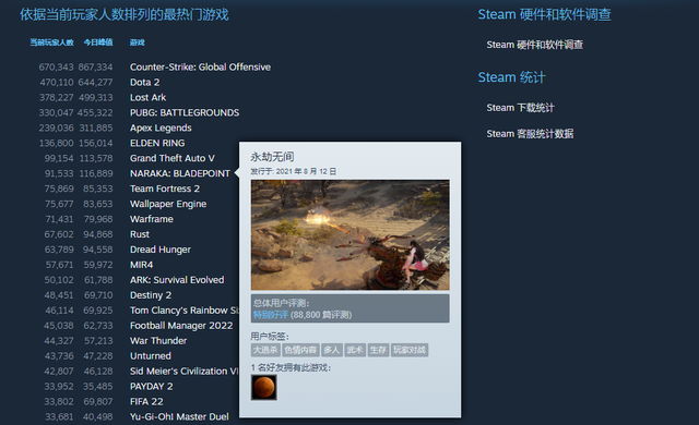 再加上游戏还上了乱斗模式和吃鸡模式,无论玩家只是想要娱乐,快乐战斗,还是想要排位,专业上分,又或者伙同几个小伙伴一起快乐吃鸡。永劫无间都能满足。也正因如此,永劫无间这款游戏很受国人的欢迎,在steam的最热门游戏的排行榜上,这款游戏的在线人数常年保持在前十。