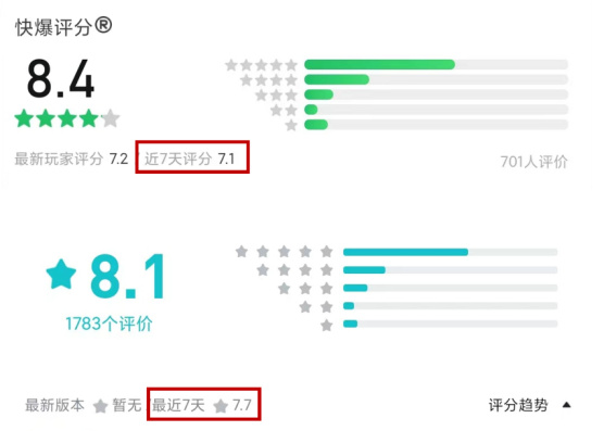 目前该游戏在好游快爆平台评分为8.4分,TapTap平台评分为8.1分。其中好游快爆平台近七天评分为7.1分,下降较为明显。