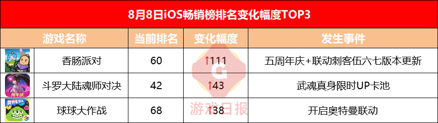 心动公司《香肠派对》8月8日开启五周年庆版本,并开启和知名国漫IP“刺客伍六七”的联动。版本更新当日,《香肠派对》iOS畅销榜排名上升111位,截至发稿,产品位于畅销榜第60位。