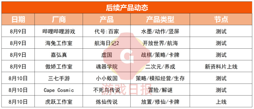 包括哔哩哔哩游戏《代号:百家》、三七手游《小小蚁国》、虎跃工作室《炼仙传说》等重点产品。本周游戏日报推荐关注的重点产品详见表格,如需交流请联系后台。