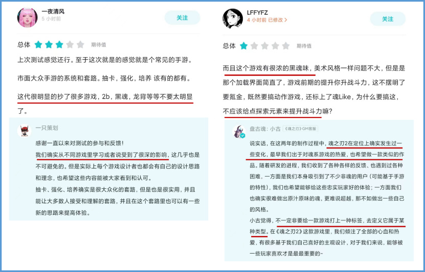 此外,有玩家指出《代号:魂之刃2》有借鉴经典之作《暗黑之魂》等的嫌疑。玩家LFFYFZ还对战斗力提升未遵照传统形式、而是摆明需要氪金的模式表示不理解。官方人员对评论给出回应,一是承认了自己受到其他游戏的影响;二是该游戏在定位上发生过变化,同时指出“不一定要给一款游戏打上一种标签”。