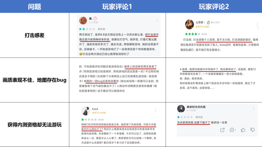 目前,《代号:魂之刃2》测试玩家给出的负面评价集中在战斗打击感差,画质表现不佳,地图存在bug等方面。另外还有玩家因自己已经获得内测资格却无法正常游玩给出低星。关于负面评价详情见下表格: