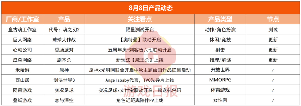 本栏目由游戏日报出品,主要覆盖游戏热点事件和游戏产品最新资讯的相关内容。本期为8月8日第64期消息,如需交流请联系后台。