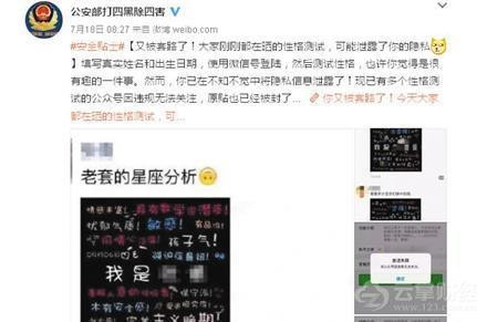 公安部治安局的官方微博“公安部打四黑除四害”发布了一则“安全贴士”,提醒大家都在晒的性格测试,可能会泄露你的隐私。