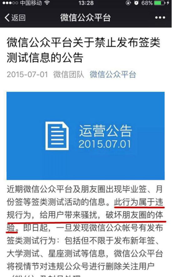 微信团队今天也给《天下公司》发来一份文字材料,指出早在去年7月,微信就已经明确:毕业签、月份签等签类测试活动的信息属于违规行为,给用户带来骚扰,破坏朋友圈的体验。