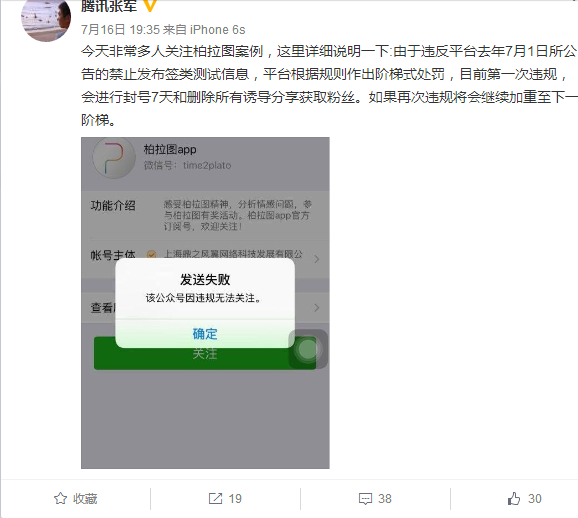 微信转发太快,就像龙卷风,当小编正在默默羡慕嫉妒他的暴风吸粉时,柏拉图APP却被封号了!