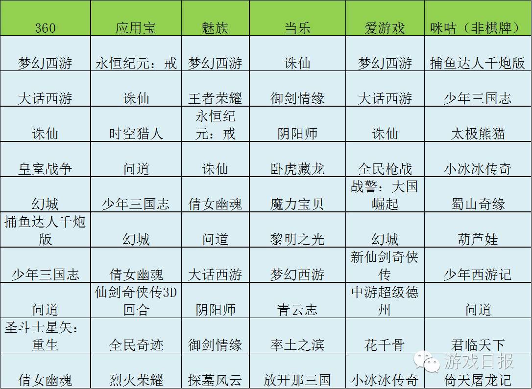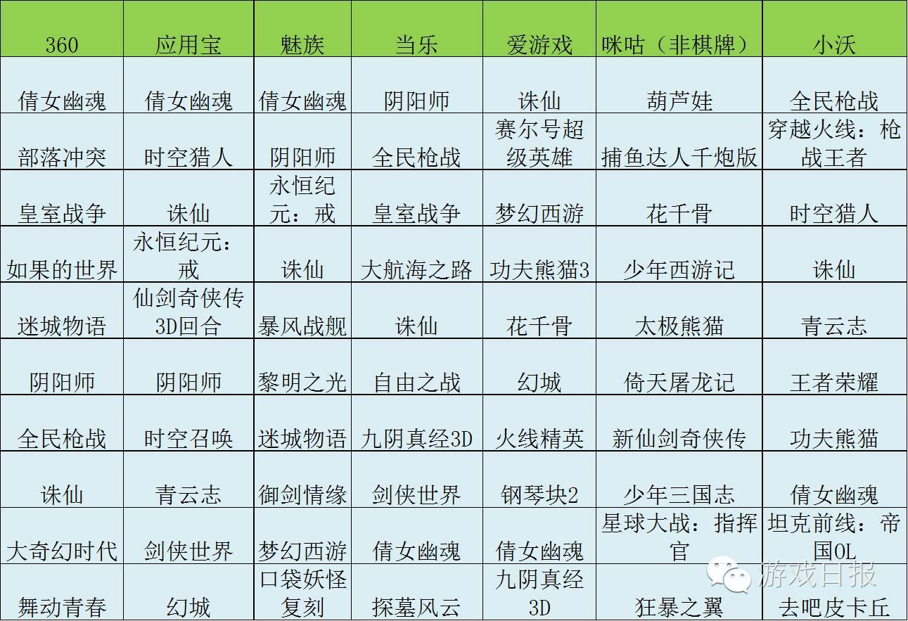 《诛仙》成为唯一一款在网游收入榜出现5次的产品,并在当乐拿下榜首位置。网易西游双雄强势不减,《梦幻西游》和《大话西游》分别在榜单中出现4次和3次,前者更是豪夺360、魅族和爱游戏3家渠道榜首位置。经典卡牌《小冰冰传奇》强势归来,在榜单中出现2次。