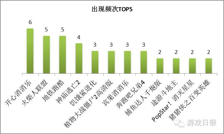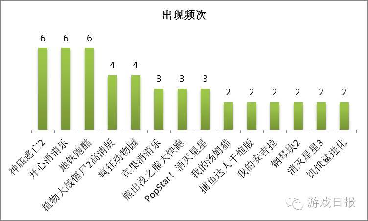 与单机榜单重合度高的现象相呼应,从产品出现频次上来看,在各渠道都有出现的产品数量高达3款,分别是《神庙逃亡2》《开心消消乐》和《地铁跑酷》,《开心消消乐》和《地铁跑酷》包揽了榜首位置,前者拿下4个,后者拿下2个。出现2次及以上的产品共计14款,仅13款游戏出现1次。