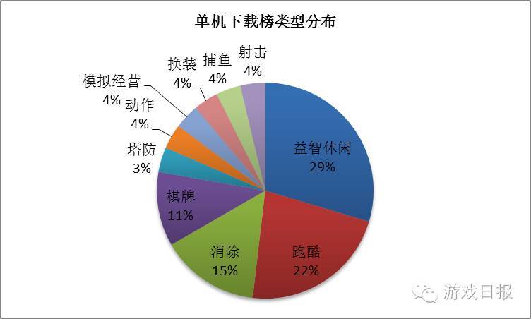 单机下载榜中,益智休闲类为第一大类,占比29%;跑酷屈居次席,占比22%;消除和棋牌类位居第二阵营,占比分别为15%和11%。TOP4类型合计占比77%,其余类型占比都不足5%,休闲益智、跑酷、消除以及棋牌是玩家最为喜爱的单机类型。