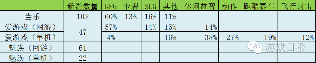 自版号规定颁布实施后,各大Android渠道每月上线新游数量明显降低。公布9月新游数量的渠道有3家,分别是当乐102款,爱游戏47款,魅族83款。网游中,RPG占比高达6成,而单机新游仍以益智休闲为第一大类。