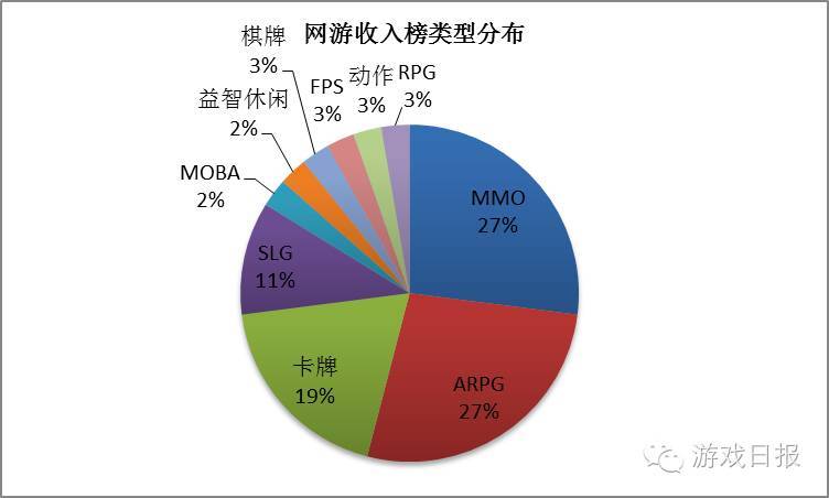 与网游下载榜相似,MMO、ARPG、卡牌和SLG稳居前4,RPG大类合计占比达57%,并已长时间维持稳定,SLG在网游下载榜和收入榜上表现俱佳。