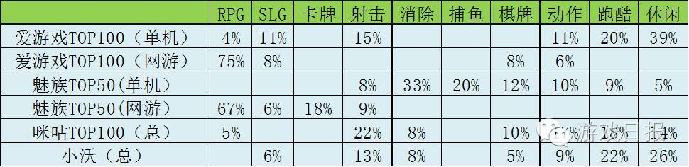 由于各大渠道口径略有差别,为方便统计,笔者去掉了部分占比极低的类型,并将魅族网游中的MMO(31%)、ARPG(11%)和回合制(25%)三类合并为RPG大类。从上图可以看出,RPG类的营收能力在网游中一枝独秀,占比达7成。而单机游戏中,休闲、跑酷、捕鱼、消除是营收主力。从咪咕和小沃不分网游单机的总体类型分布来看,休闲、跑酷、射击是其中的佼佼者,这一方面说明了运营商小额快捷短代支付的优势,另一方面也证明了中轻度类型产品在市场大盘中营收能力并不低。
