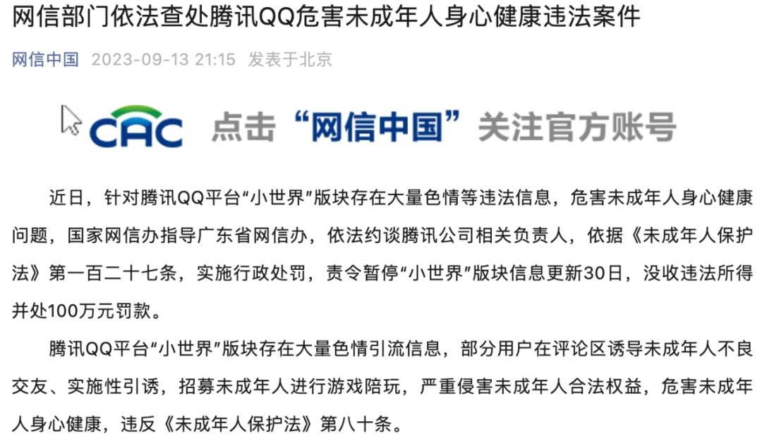 问题,国家网信办指导广东省网信办,依法约谈腾讯游戏机手机壳公司相关负责人,依据《未成年人保护法》第一百二十七条,实施行政处罚,责令暂停“小世界”版块信息更新30日,没收违法所得并处100万元罚款。